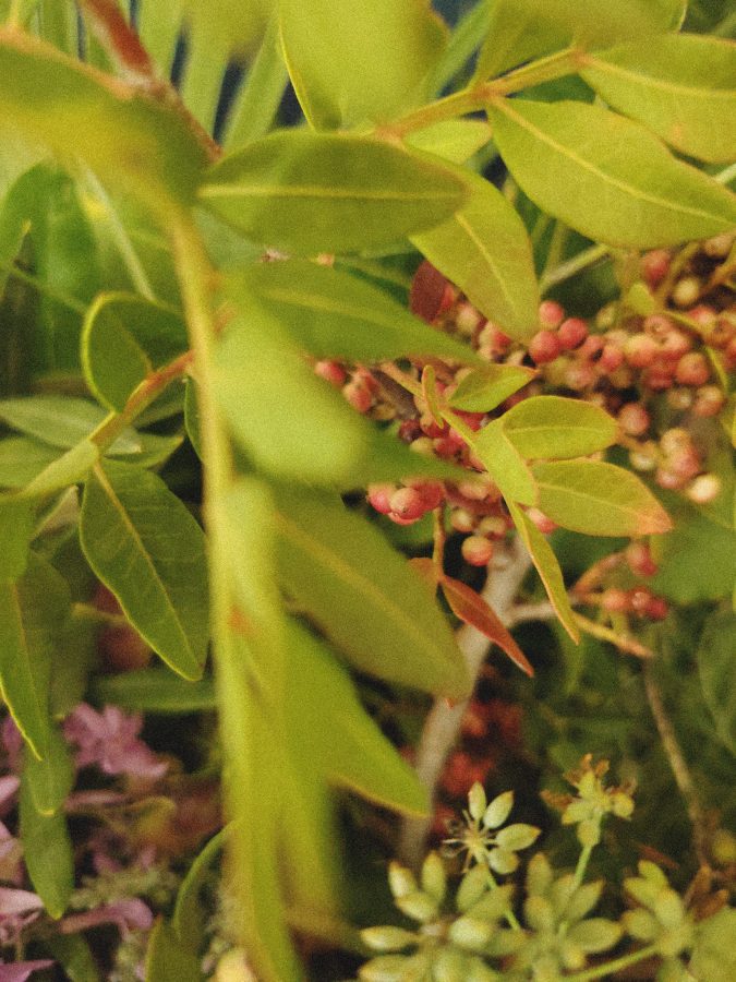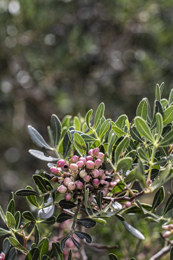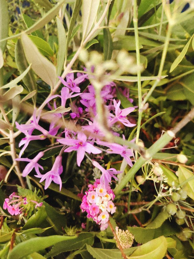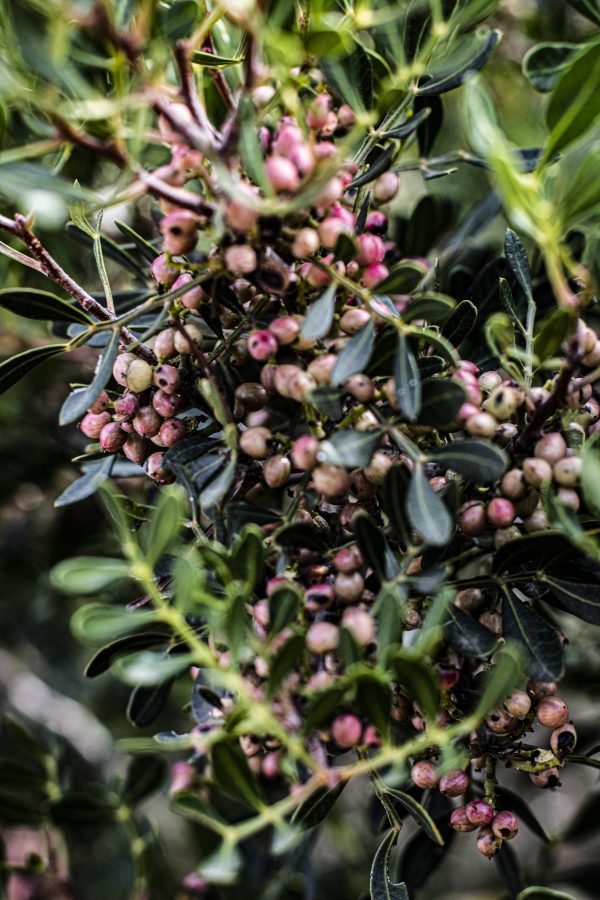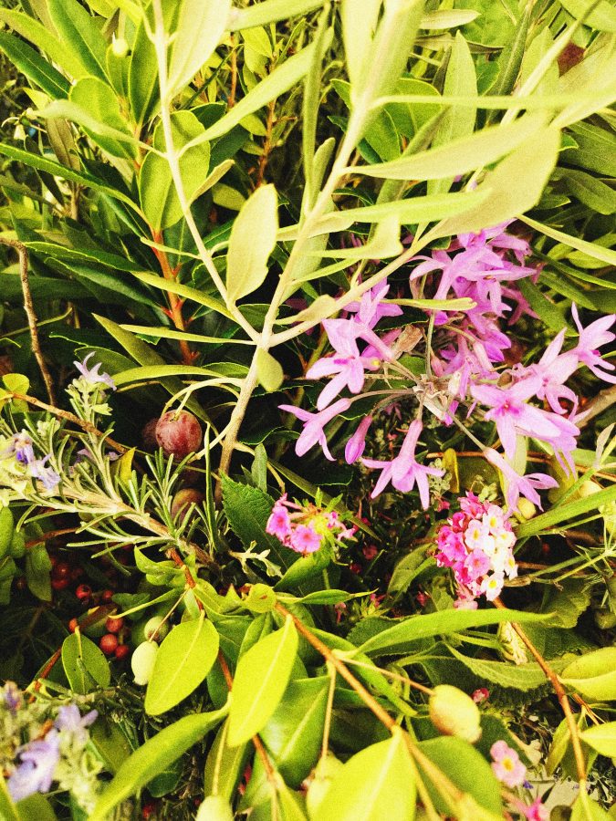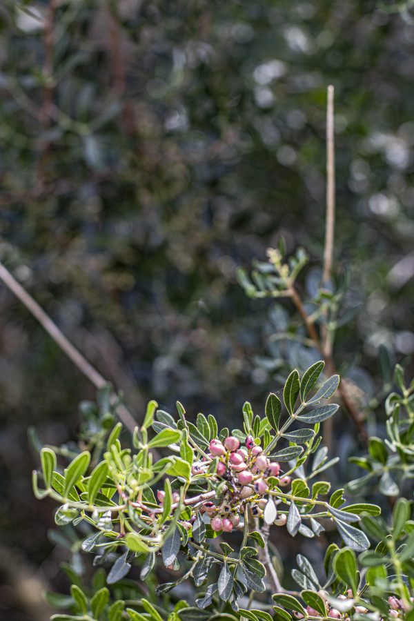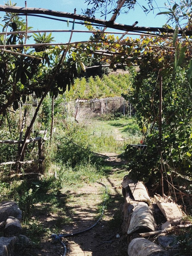 Sulla soglia le viti, i nespoli, l’olivastro, lentisco, cachi, agrifoglio, serpolino, aquilegia, timo e innumerevoli altre. Una natura rigorosa e spregiudicata si attorciglia e dà il benvenuto.