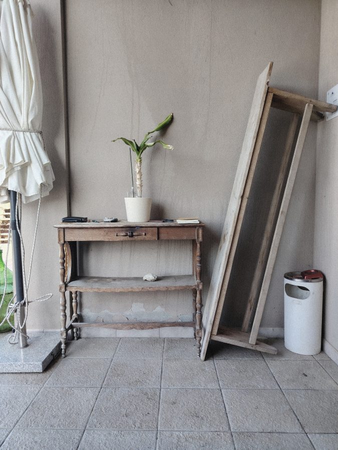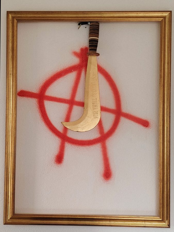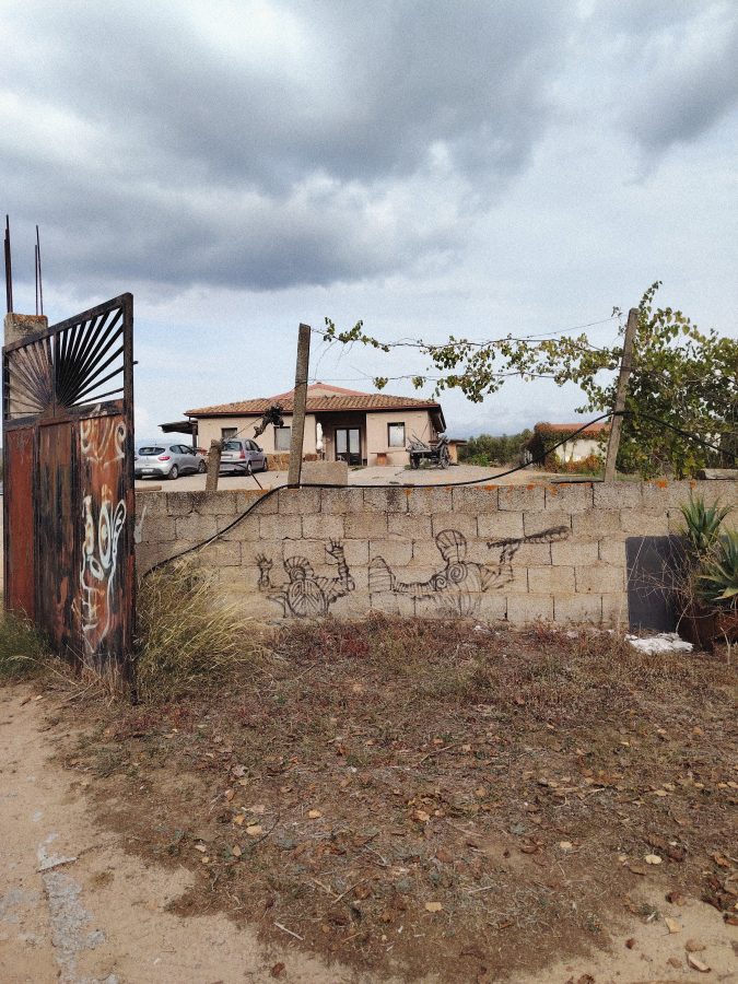 Su un sottofondo permanente di musica e natura brada, Sa Defenza è dunque luogo d’arte, tra campi, cave di minatori, boschi, magazzini e cantine. Di suoni, di oggetti d’artificio. Tra tutti, quelli accumulati da babbo Salvatore. Manufatti di un passato agricolo donerese, modernista, già industrializzato, tra caschi protettivi interstellari, trabiccoli, motori, trattori, riposti ovunque: in piccoli depositi, sul battuto di cemento di fronte casa, tra i cespugli. E ancora, le opere di Paolo, che sono potenti visioni di questi tempi e quelle donate da artiste e artisti, su pareti, muretti, nell’orto, tra cicerchia e asparago; macerazione e sedimento, deposito sul fondo delle moltissime iniziative culturali lì avvenute. La natura e le cose si rimescolano, si trasformano e rinascono, sovescio e feccia, come piriciolu, bevanda dei tempi di povertà, destinata a is serbidoris, ai lavoratori, prodotta dalle vinacce esauste, dagli scarti, come si aveva in uso.