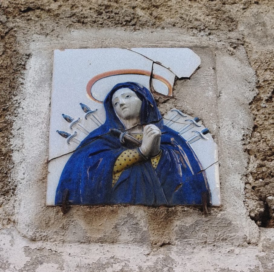 Gli acini di sangue di Cristo esplodono di rosso tra le dita di Peppino.