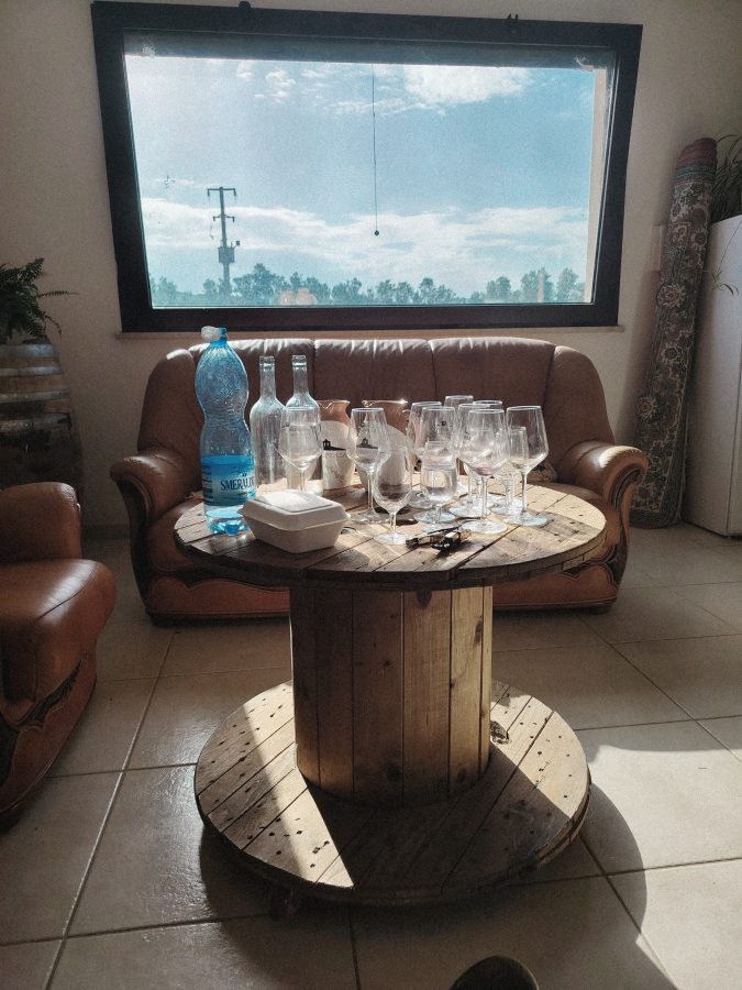 Una bella casina di legno ospita le bevute attorno al grande tavolo. Le bevute, non le degustazioni. Perché con Peppino è obiettivamente difficile degustare, saggiare, testare. Si fa esperienza piena, completa, full experience. Mangi mangi e bevi bevi.
